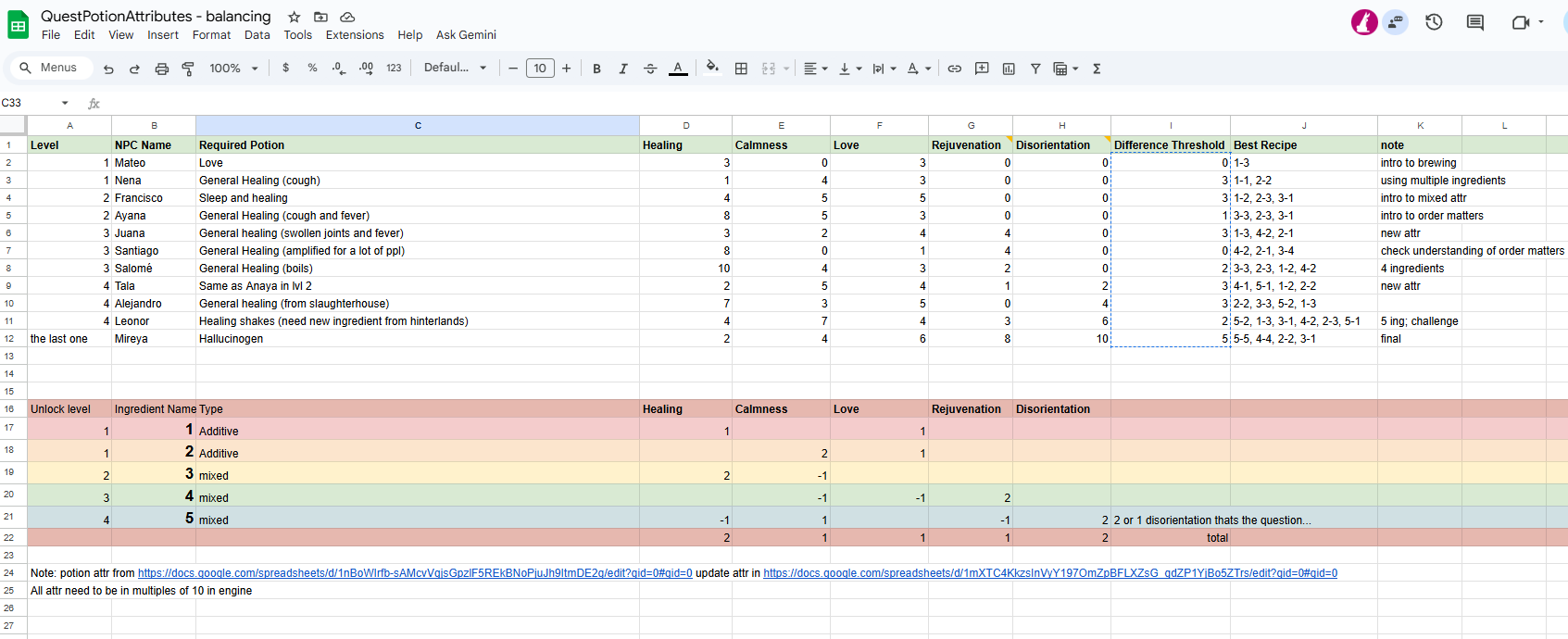 Required potion column shows the kind of potion the player will have to make according to the narrative, which is taken into consideration when setting the ideal attribute of the quest potion.
