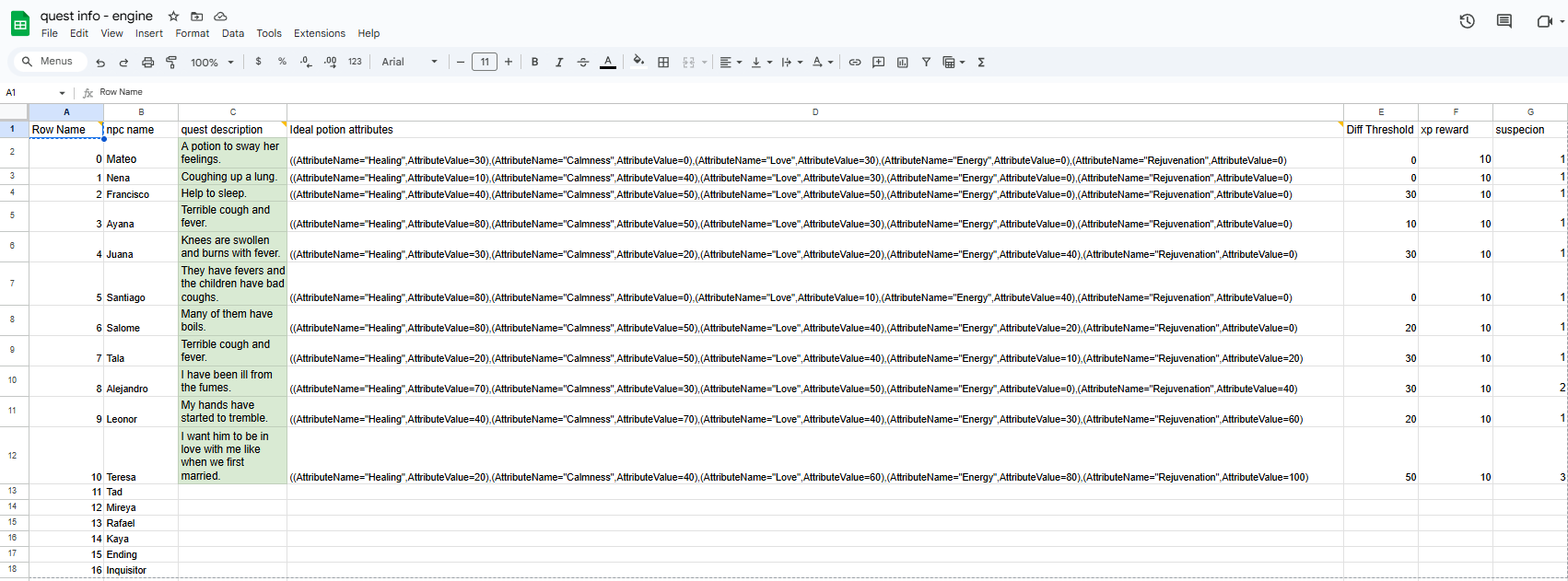 I designed and implemented a spreadsheet-driven workflow to streamline balancing and updating quest-related values. By exporting data as a .csv file and integrating it into the engine, I automated the process of populating quest parameters, improving efficiency and reducing manual implementation time.